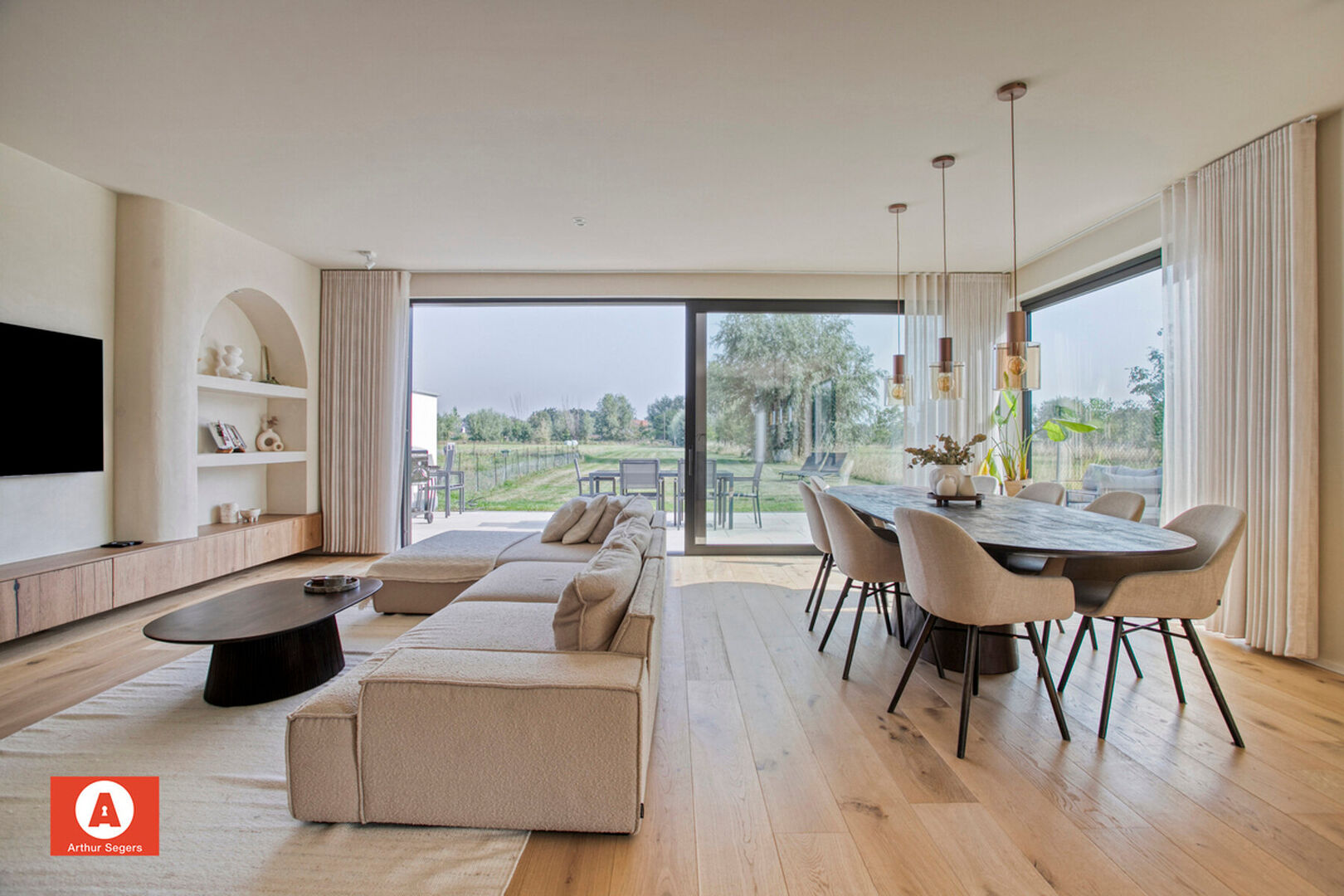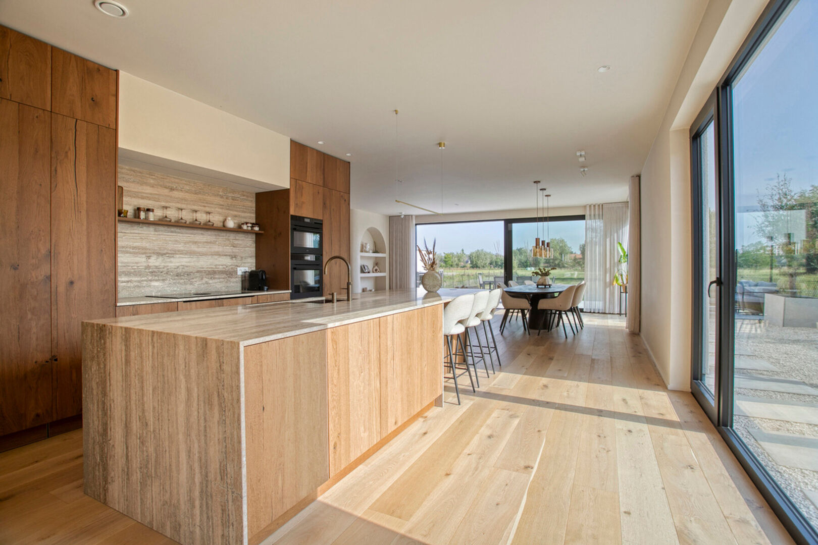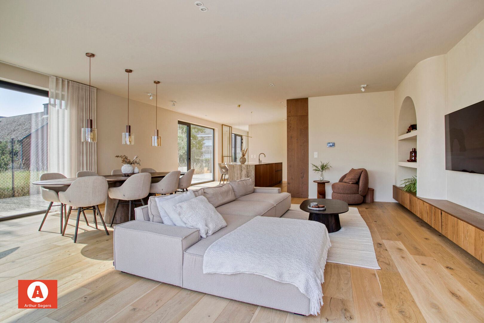 Op een perceel van 1.470 m² in Dendermonde bevindt zich deze instapklare designparel (2024) in Japandi-stijl. Geen standaard nieuwbouw, maar een tot in detail afgewerkte woning waar natuurlijke materialen, rust en functionaliteit samenkomen. Grote raampartijen zorgen voor licht en zicht op de ruime tuin, terwijl travertin, mortex, eiken parket en fineerhout een warme en tijdloze uitstraling creëren – een harmonieus geheel zoals u dat enkel ziet op de beste Pinterest-inspiratieborden en in designbladen.