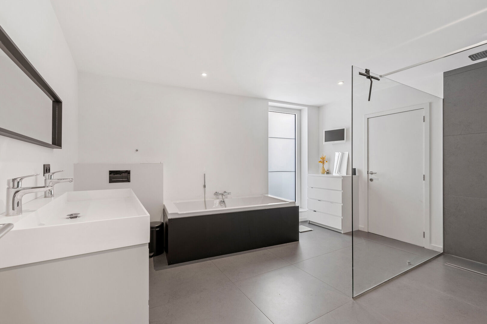 Op de eerste verdieping vind je de mastersuite met dressing en rechtstreekse toegang tot de luxueuze badkamer met ligbad, ruime inloopdouche, lavabo en toilet. Daarnaast zijn er nog drie volwaardige slaapkamers met elk een eigen dressing.