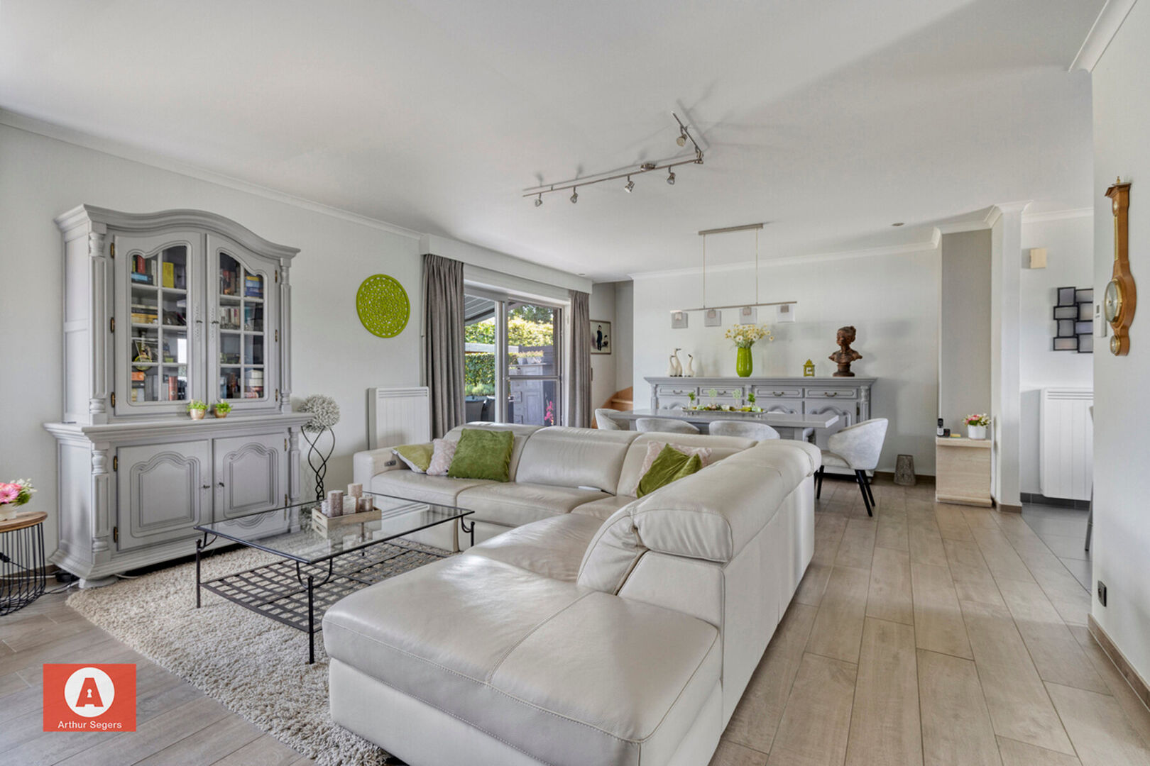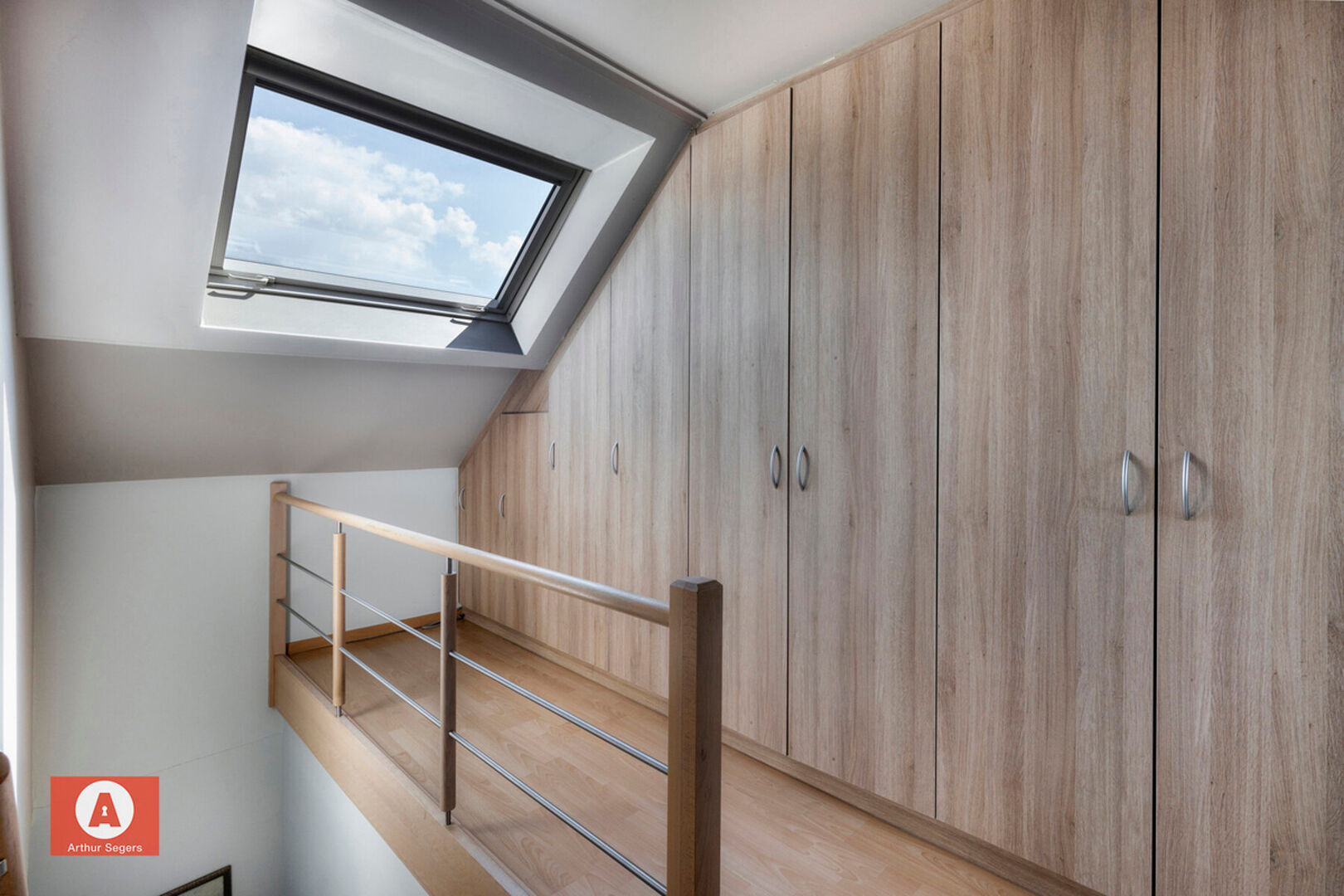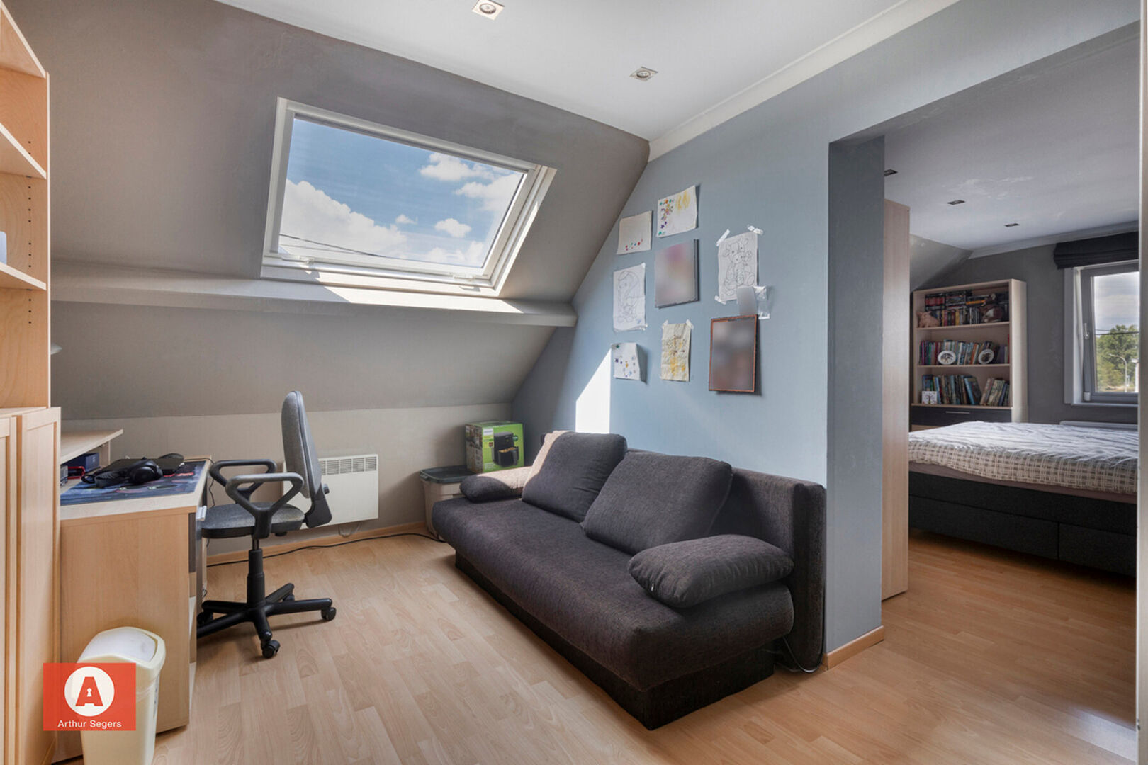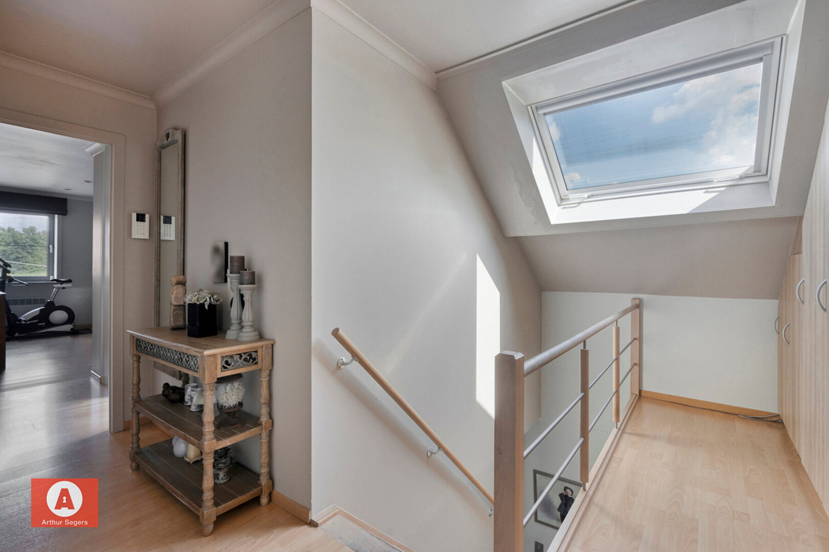 De woning beschikt over een inkomhal, lichtrijke leefruimte met zicht op de tuin, volledig uitgeruste keuken met Miele-toestellen, garage en praktische berg-/wasplaats met doorgang naar de werkplaats. Boven: nachthal met ingebouwde kasten, masterbedroom met dressing, doorloopkamer (bureau), derde slaapkamer en badkamer.