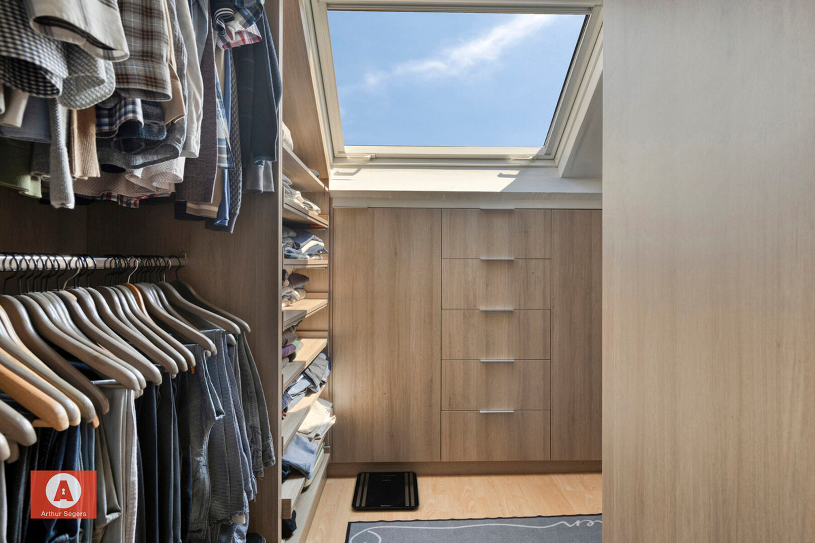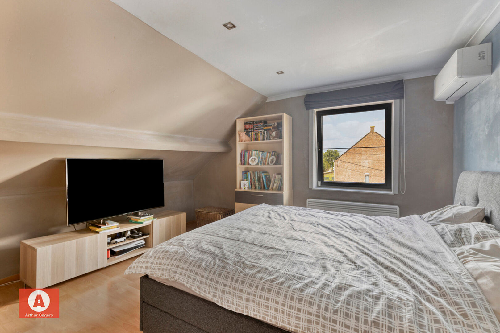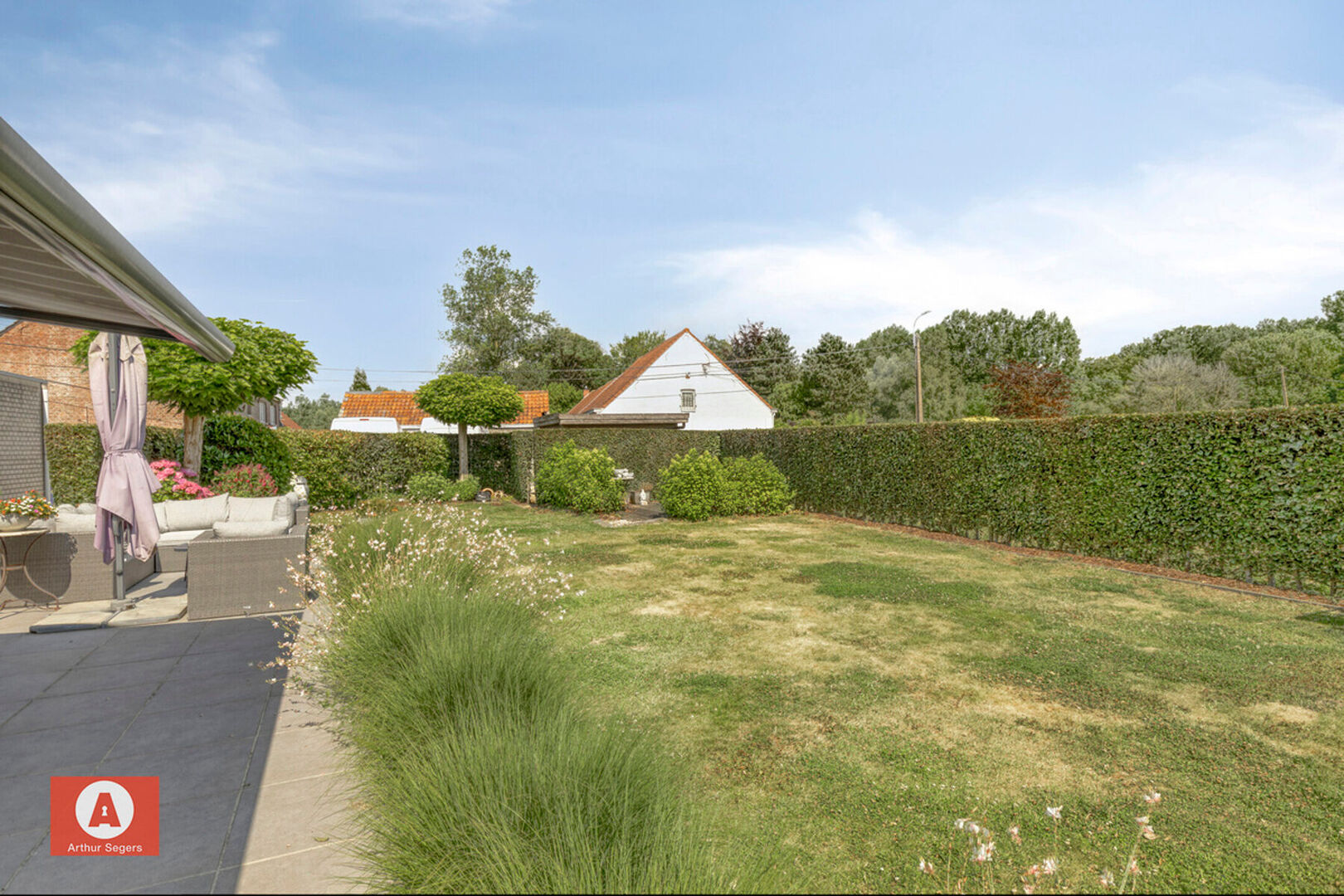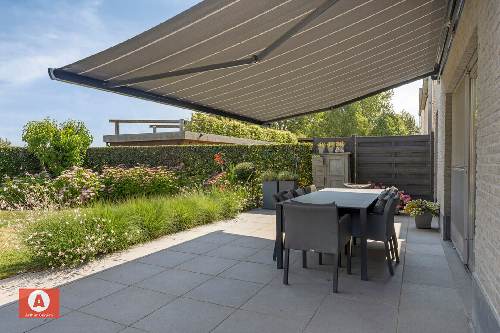 De woning beschikt over een inkomhal, lichtrijke leefruimte met zicht op de tuin, volledig uitgeruste keuken met Miele-toestellen, garage en praktische berg-/wasplaats met doorgang naar de werkplaats. Boven: nachthal met ingebouwde kasten, masterbedroom met dressing, doorloopkamer (bureau), derde slaapkamer en badkamer.