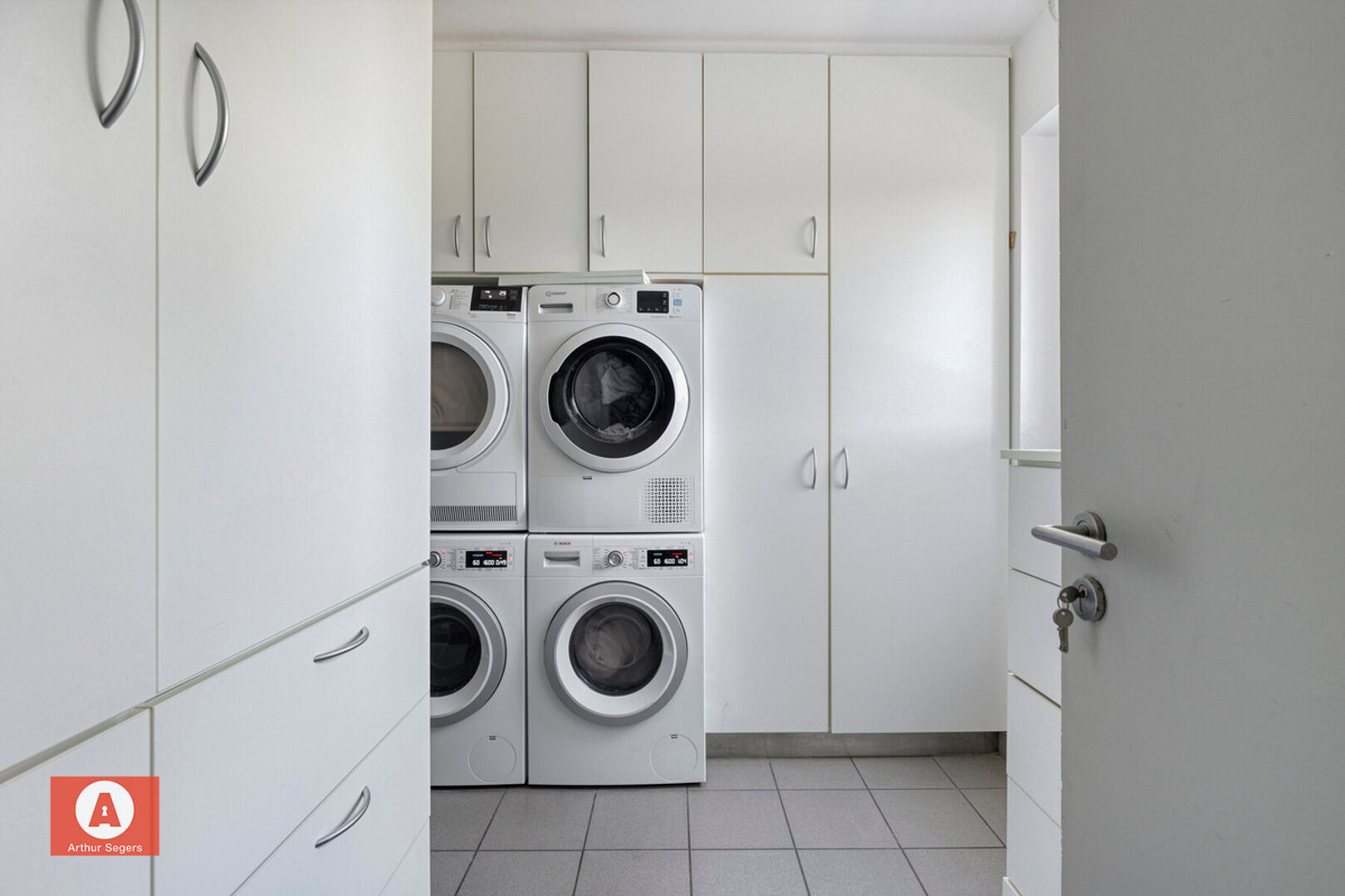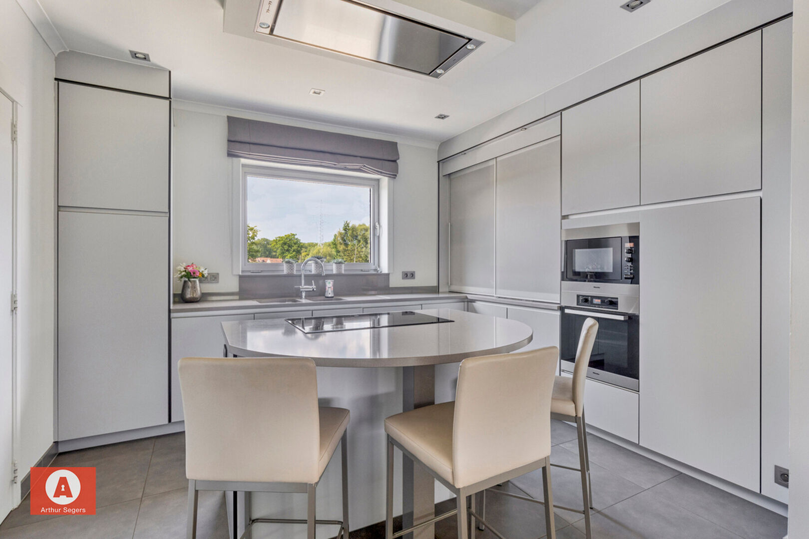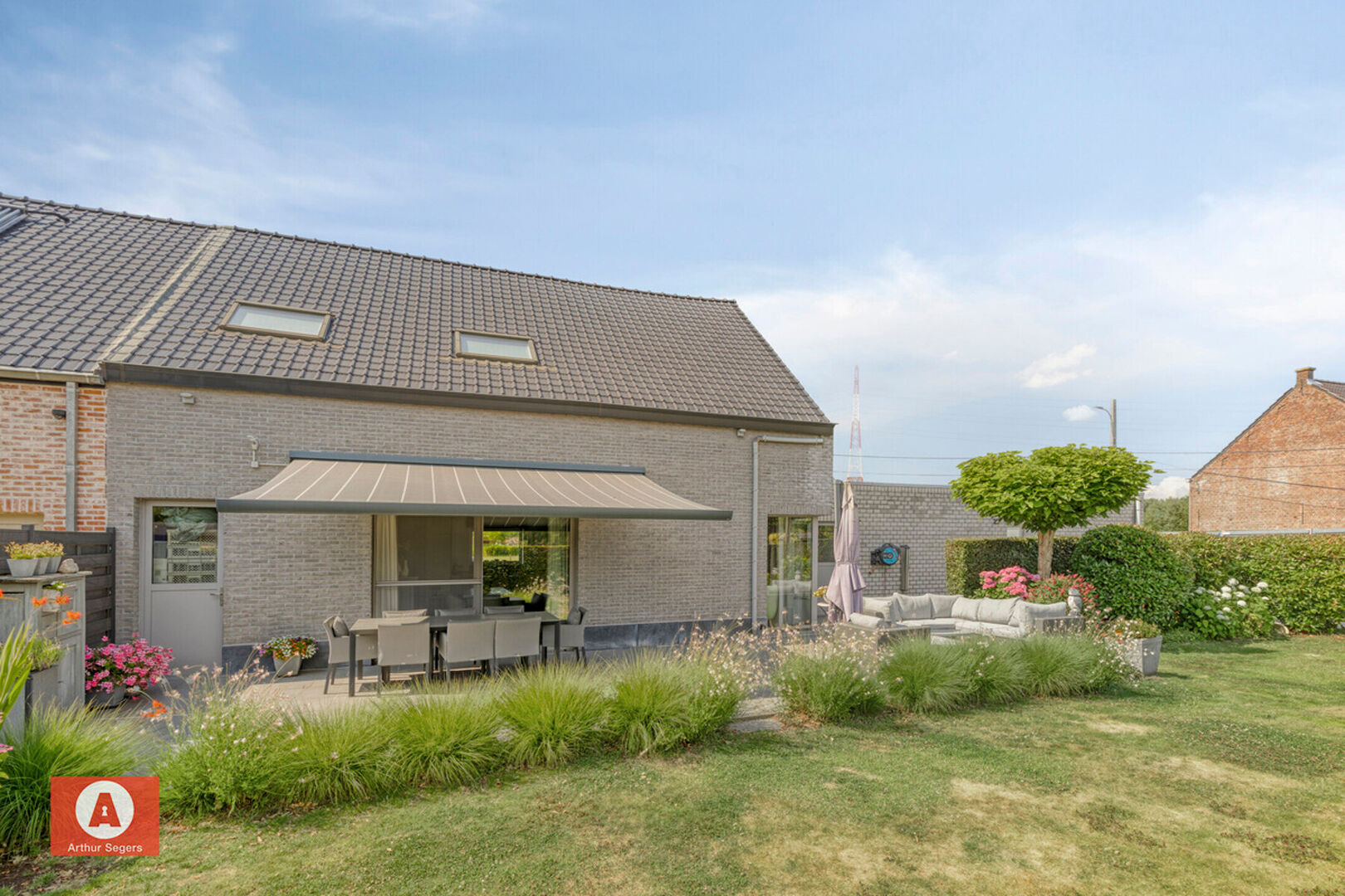 De woning beschikt over een inkomhal, lichtrijke leefruimte met zicht op de tuin, volledig uitgeruste keuken met Miele-toestellen, garage en praktische berg-/wasplaats met doorgang naar de werkplaats. Boven: nachthal met ingebouwde kasten, masterbedroom met dressing, doorloopkamer (bureau), derde slaapkamer en badkamer.