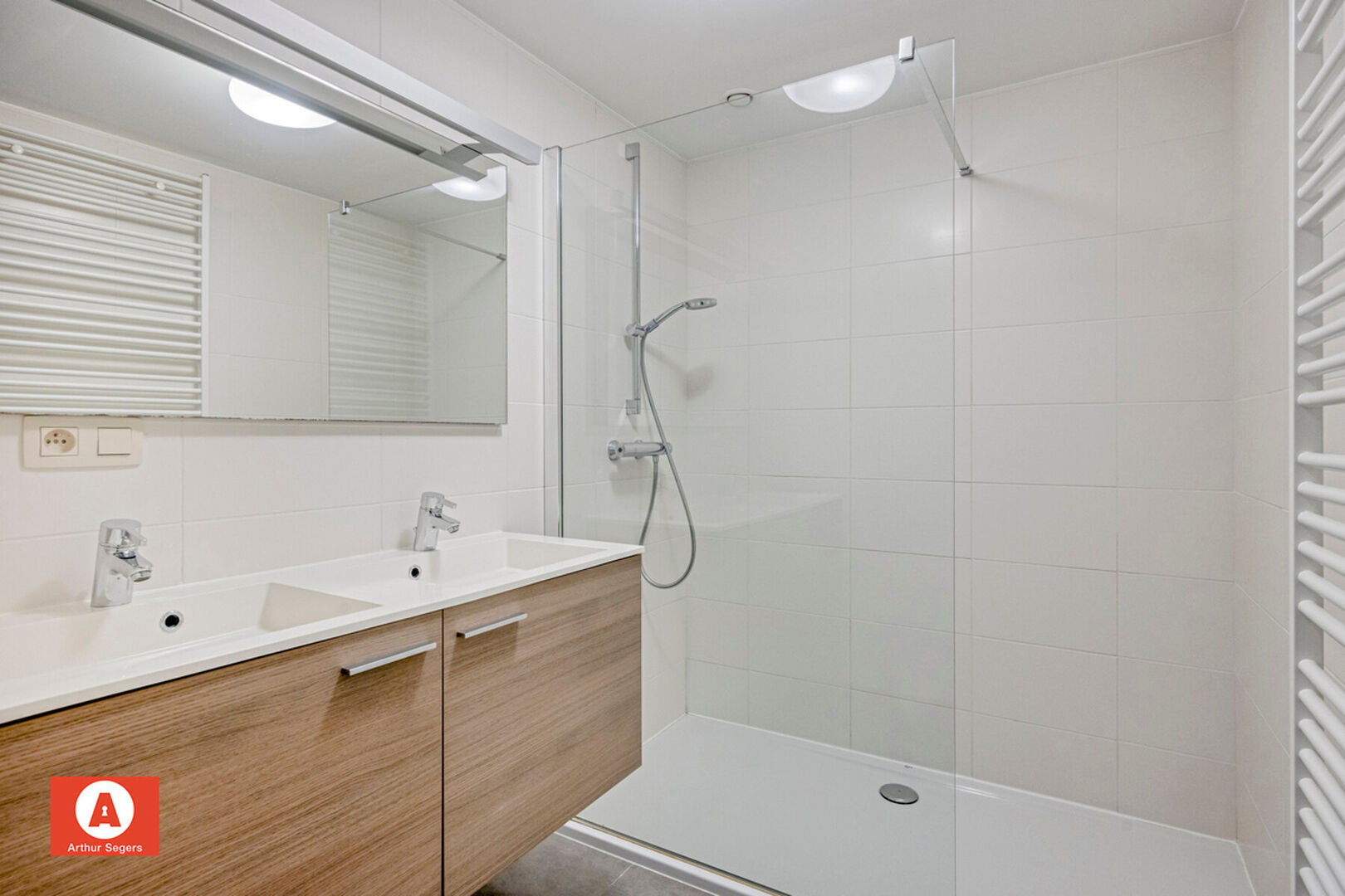 Indeling: inkomhal, open leefruimte met volledig uitgeruste keuken, 2 slaapkamers, berging/wasplaats en moderne badkamer met dubbele lavabo en inloopdouche. Toegang zowel via de gemeenschappelijke inkomhal vooraan als privatief langs achter.