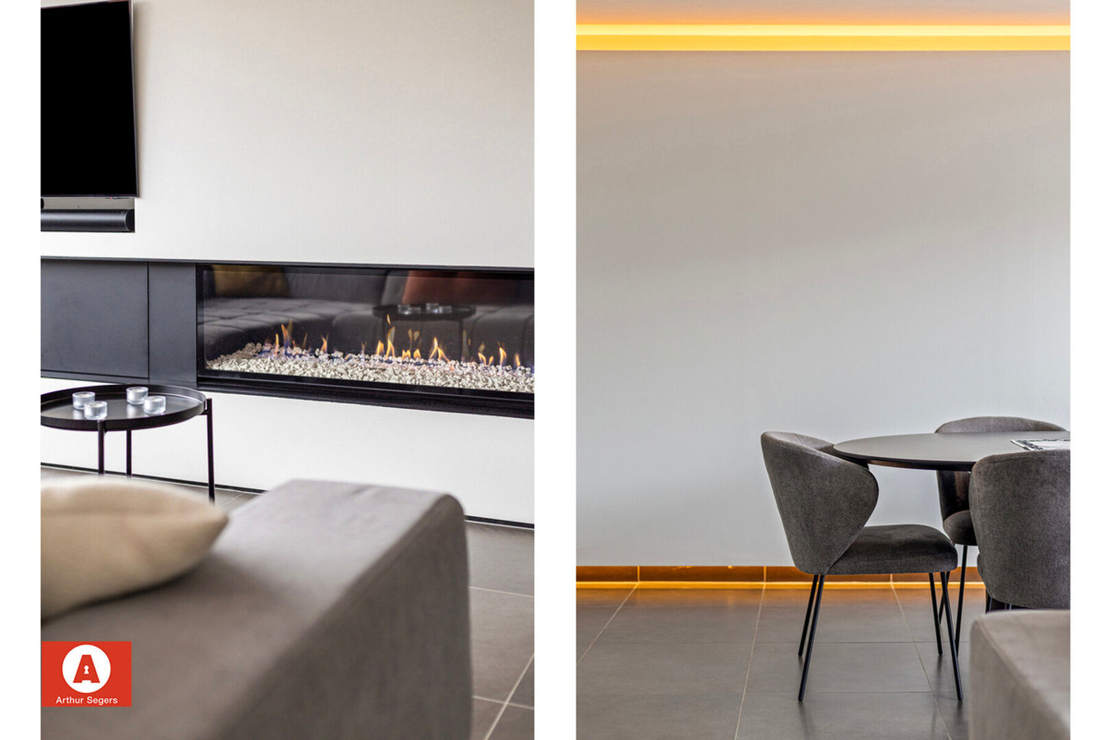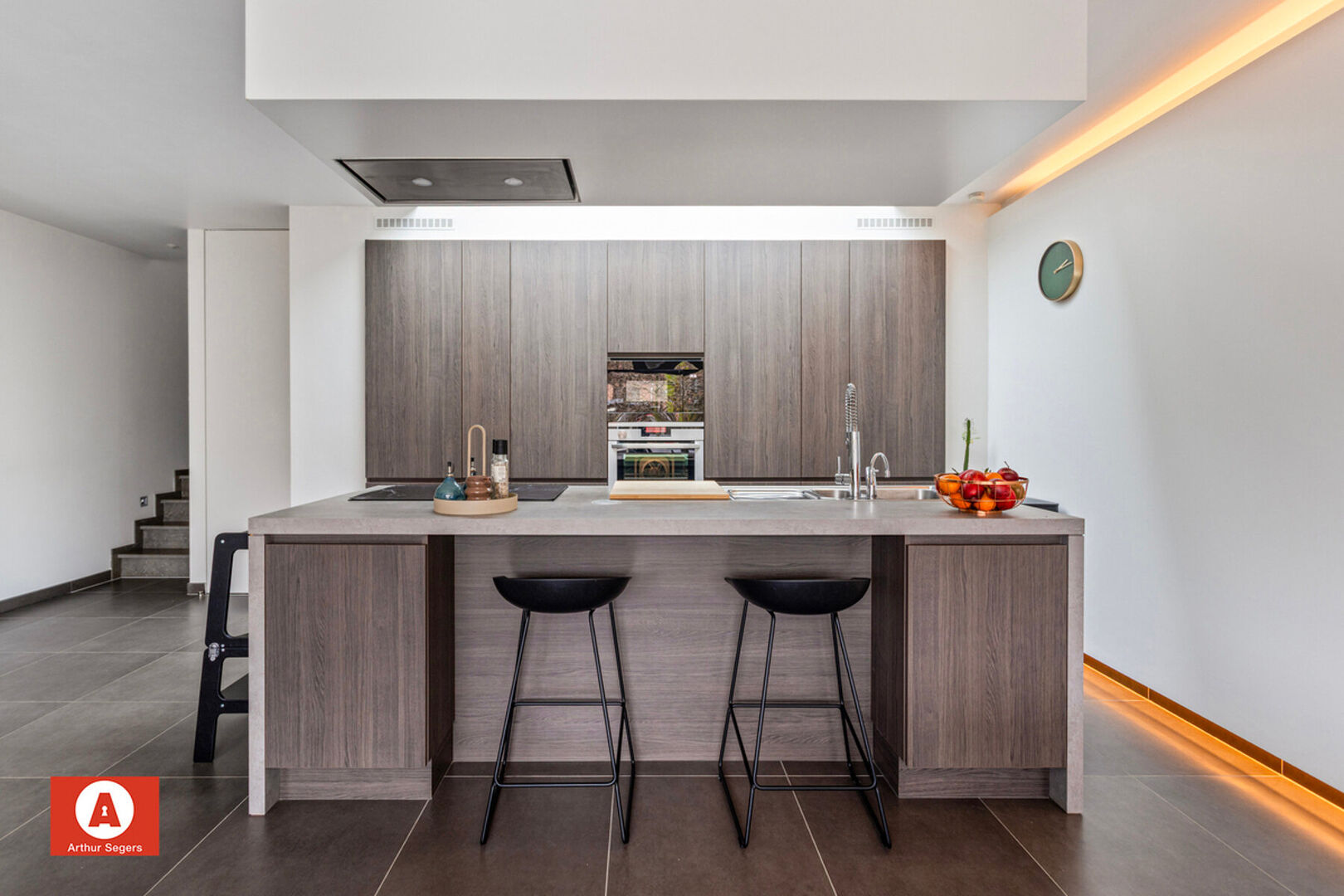 Op het gelijkvloers is er de inkomhal, leefruimte (incl. maatmeubel & gashaard) met aansluitend de keuken, berging/wasplaats, inpandige garage en het gastentoilet terug te vinden.