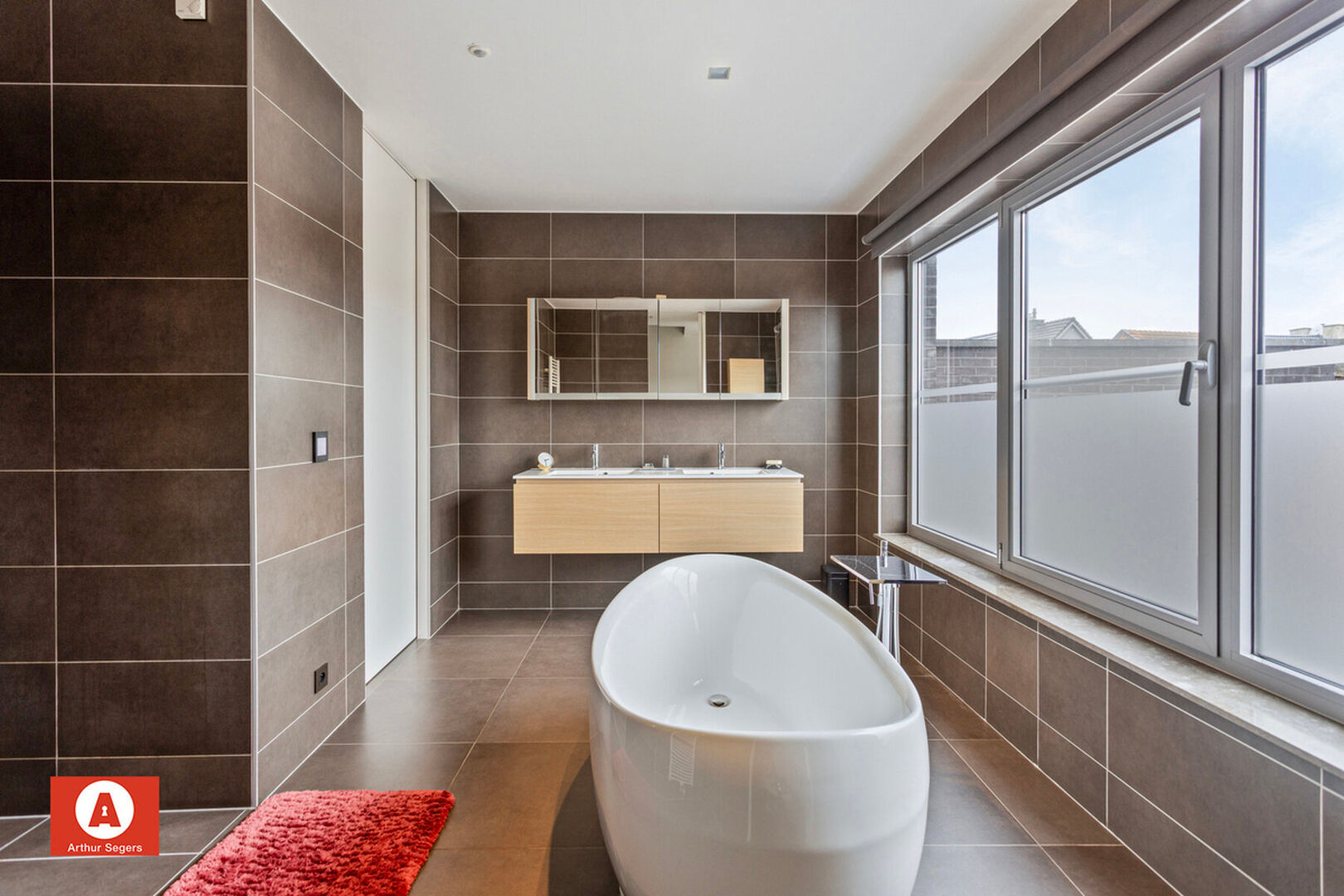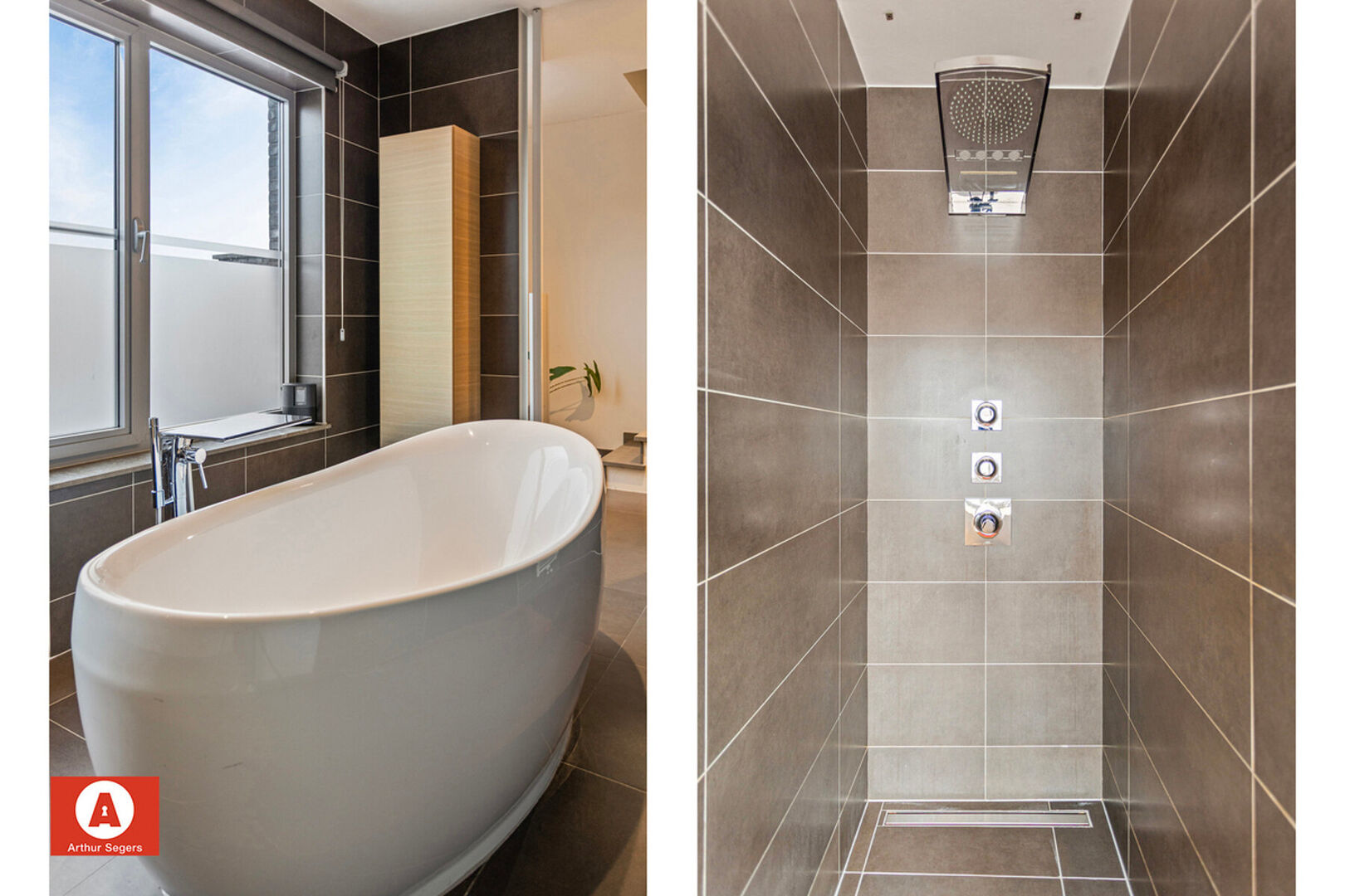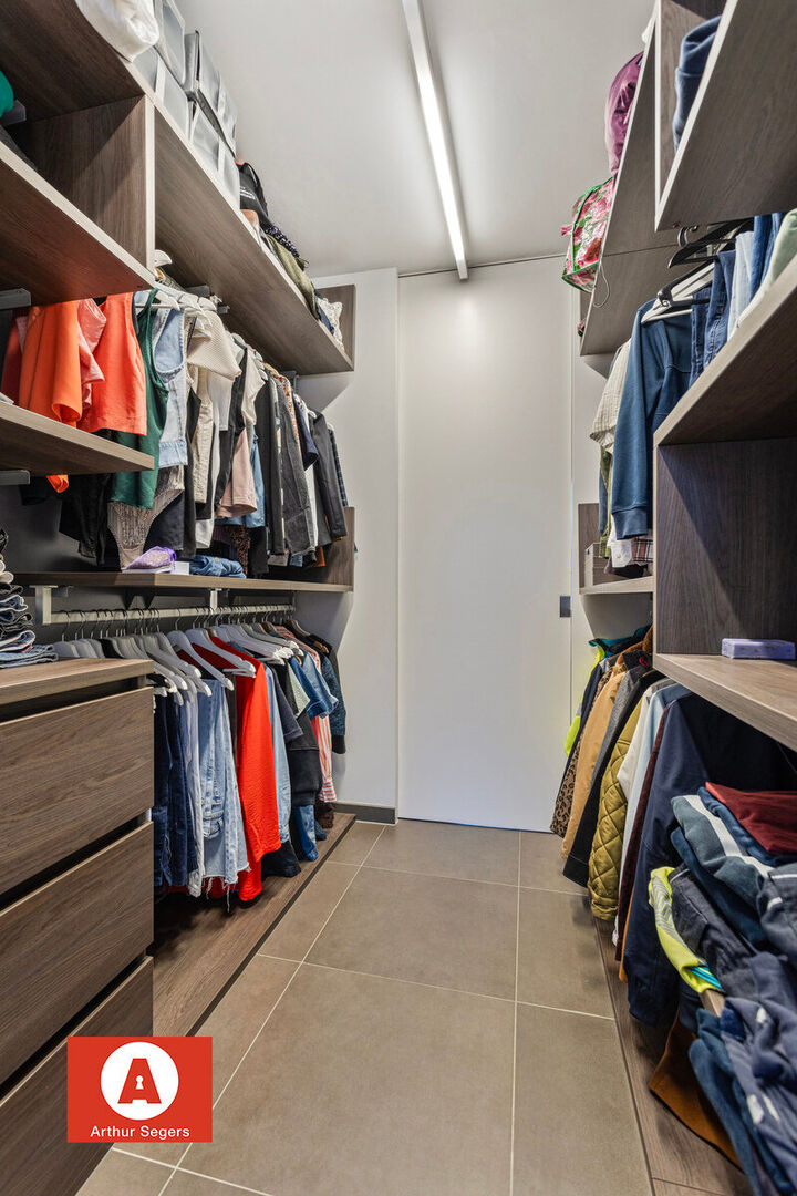 Op de eerste verdieping zijn er het bureau (of eerste volwaardige slaapkamer), de tweede slaapkamer met aansluitend de doorloop-dressing met daaraan aansluitend de design-badkamer (inloopdouche, open ligbad, dubbele lavabo) en het tweede toilet terug te vinden.
