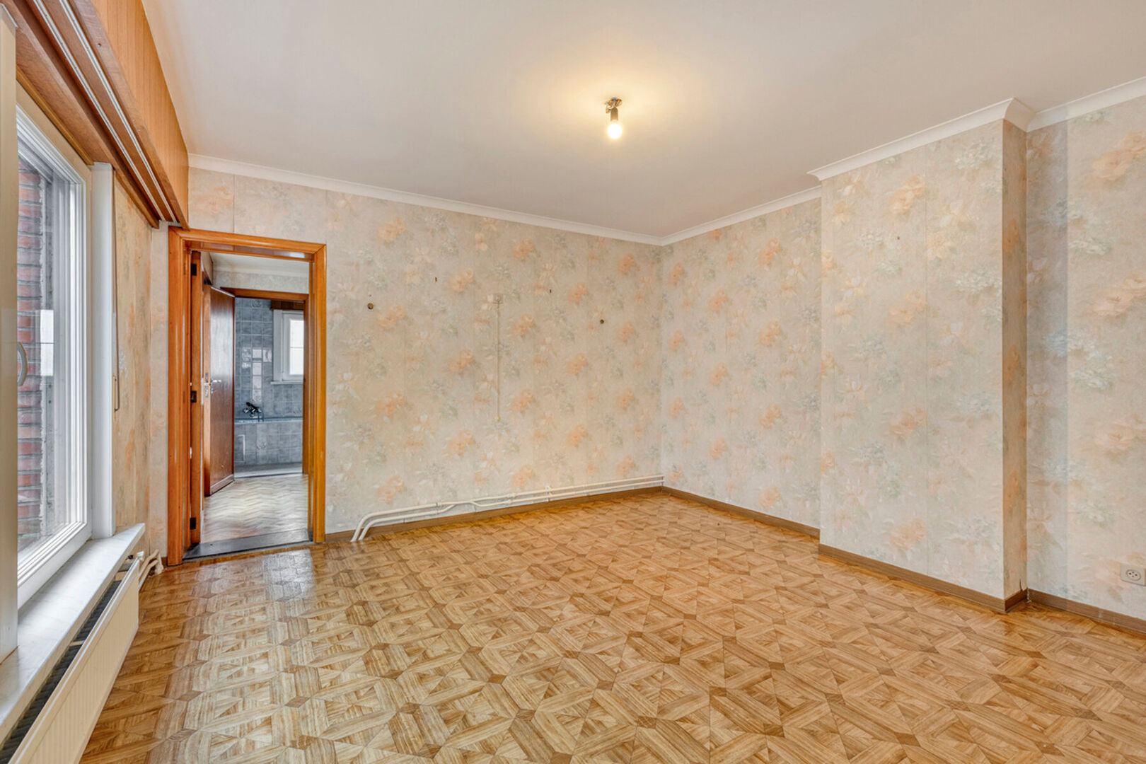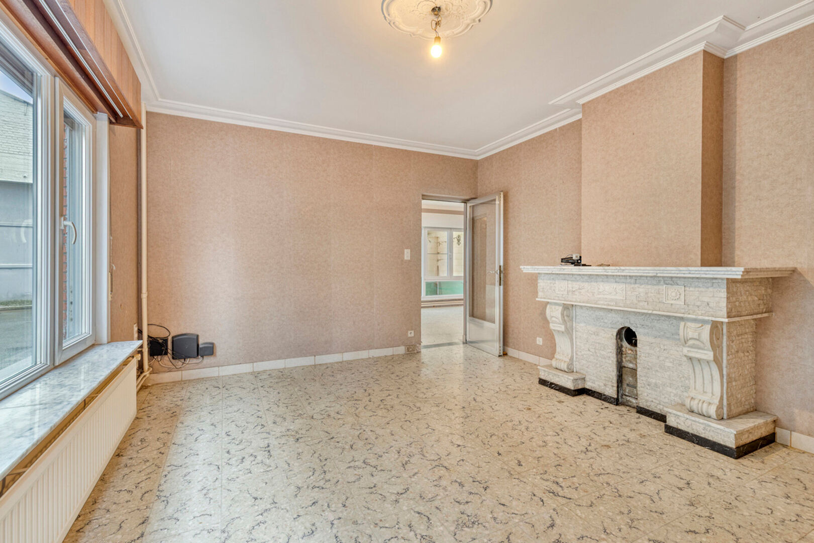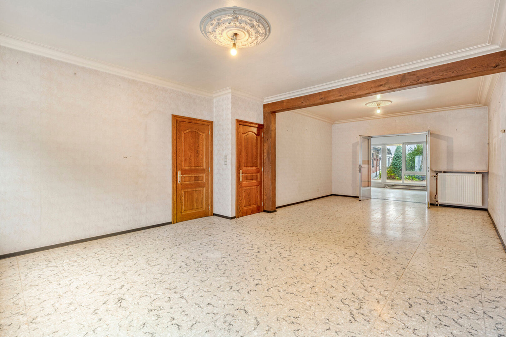 In de Mechelseweg, op 100 meter van de Vaart en op wandelafstand van het centrum van Kapelle-op-den-Bos, bevindt zich deze ruime en solide halfopen bebouwing met bijzonder veel potentieel. De woning, gebouwd in 1963, staat op een perceel van 3a 60ca en biedt een royale bewoonbare oppervlakte van 250 m². De betonnen gewelven verzekeren een uitstekende structurele basis voor renovatie. De huidige indeling omvat een inkomhal, een lichtrijke leefruimte en een afzonderlijke eetplaats, beide met toegang tot de keuken en veranda. Daarnaast zijn er een toilet en douche op het gelijkvloers. Op de eerste verdieping bevinden zich twee zeer ruime slaapkamers en een derde kamer met berging/dressing die doorloopt naar de badkamer. Een vaste trap leidt naar de grote zolder, perfect in te richten als extra kamers of bergruimte. De woning beschikt tevens over een droge kelder.