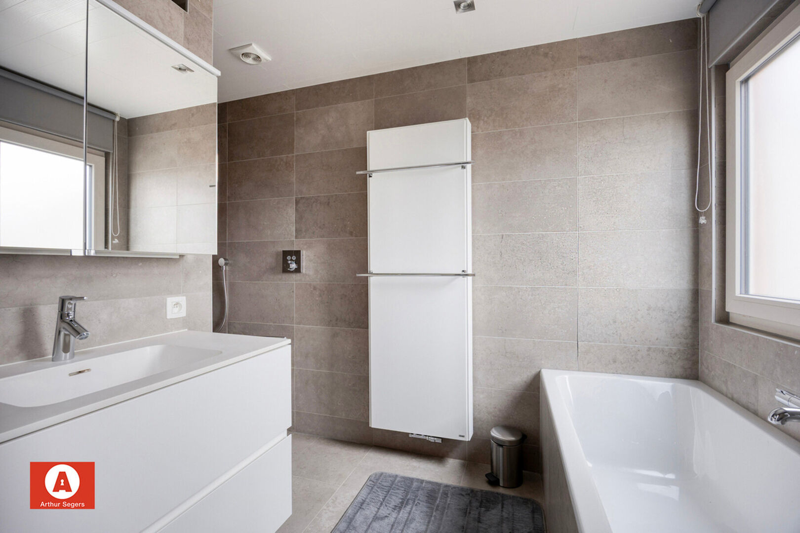 Indeling: op het gelijkvloers zijn de inkomhal, de keuken, leefruimte met zit- en eethoek, de tussenplaats/veranda, de volledig uitgeruste badkamer (bad, inloopdouche, lavabo) en het gasten-toilet terug te vinden. Bergkelder voorhanden. Op de eerste verdieping zijn er 3 volwaardige slaapkamers en een tweede toilet terug te vinden.